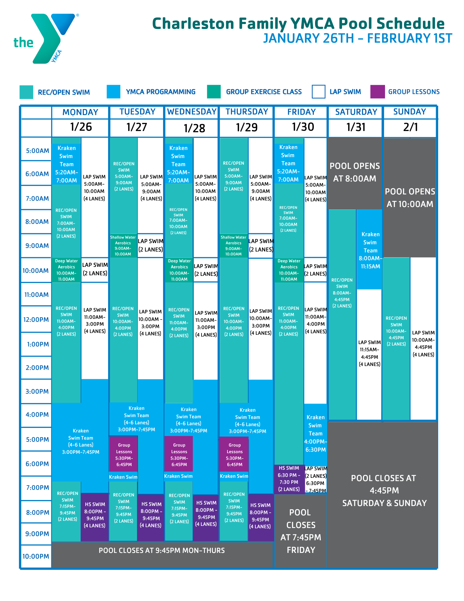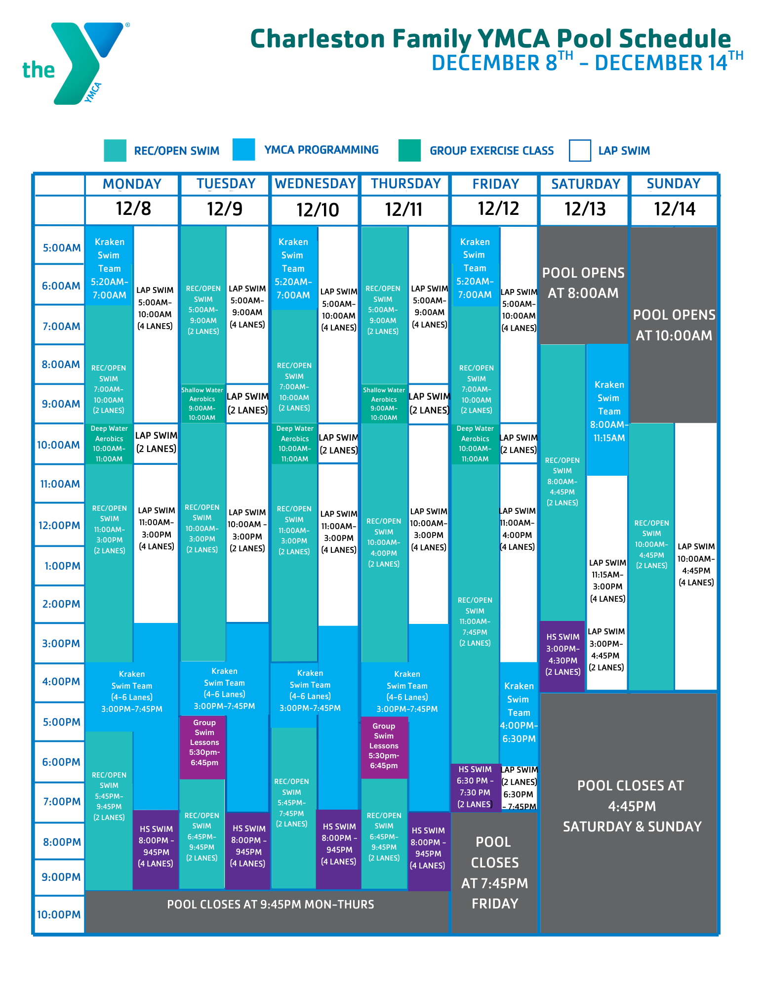 The Charleston Family YMCA is equipped with a 6-lane indoor pool. Every child under the age of 12 years is required to be tested on their swimming ability if their parent/guardian is not swimming with them. View the pool rules for more information.